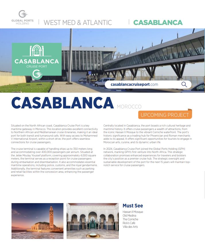 Casablanca Cruise Port operates 24 hours a day to accommodate vessel arrivals, departures, and port operations, with passenger services aligned to cruise ship schedules.